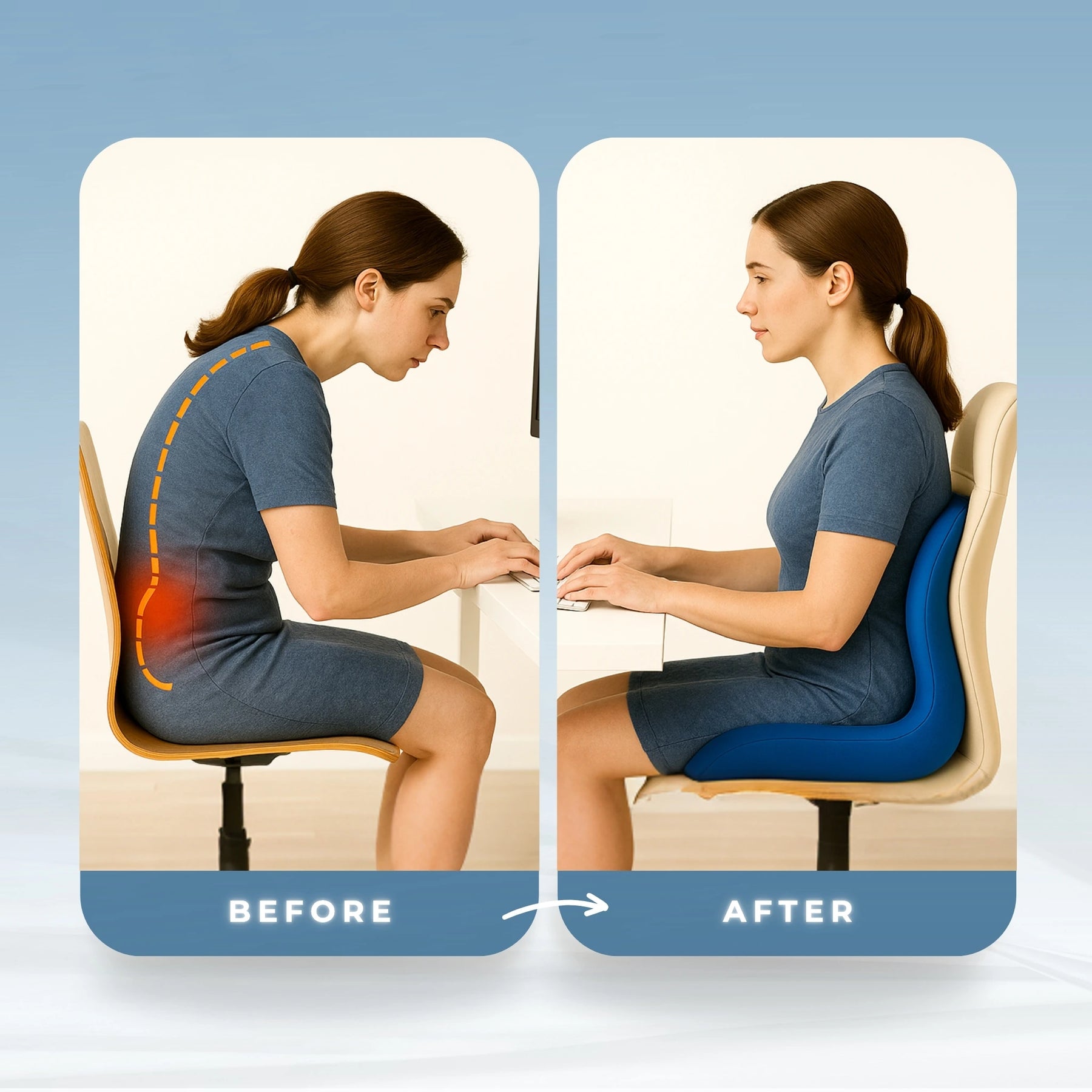 Provides deluxe comfort for those with back pain or posture concerns. Our cushion provides deep ergonomic support to relieve pressure on the lower back and spine — helping to correct alignment, ease tension, and restore natural comfort for long hours of sitting.